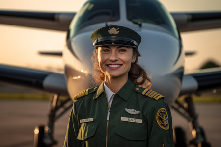 illustration of smiling female pilot standing in front of airplane with Generative AI
