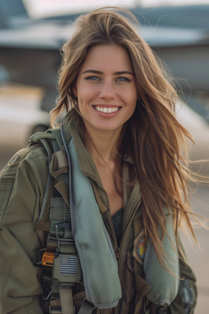 A confident female aviator stands on the runway, showcasing classic style and determination. The sunlit background features a jet, emphasizing her passion for aviation.