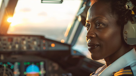 Focused female pilot flying commercial airplane in cockpit at sunset ensuring safe and professional air travel experience
