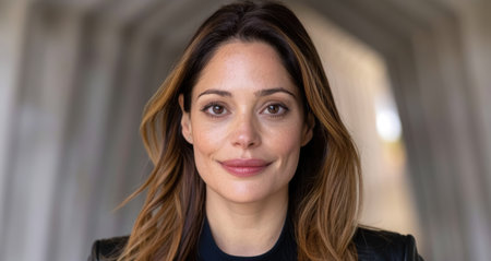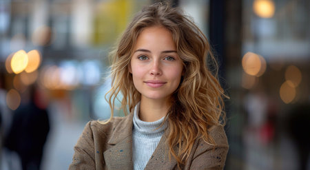 Portrait of a confident young professional woman smiling warmly against a blurred modern building background.