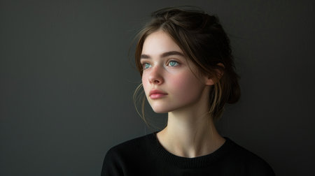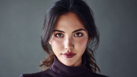 A young woman with long dark hair poses confidently. She is wearing a dark turtleneck sweater. The soft gray background creates a calm atmosphere that highlights her features.