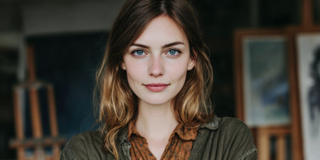 A young woman stands in an art studio with light coming in. She has long hair and is wearing a simple shirt. Paintings and art supplies are visible behind her.
