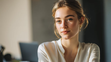 A young woman with blonde hair pulled back, wearing a white silk blouse and gold hoop earrings, looks thoughtfully into the distance. The soft lighting suggests she might be in an office or a well-lit room, possibly contemplating a business decision or personal reflection.