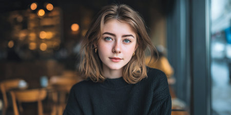A young woman with freckles and blue eyes looks directly at the camera, her hair is light brown and she is wearing a dark sweater. The background is blurred, suggesting she is in a cafe or restaurant.