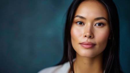 A stunning portrait features a confident young woman with long dark hair and a serene expression, exuding beauty and charm against a soft blue background.