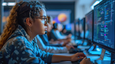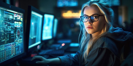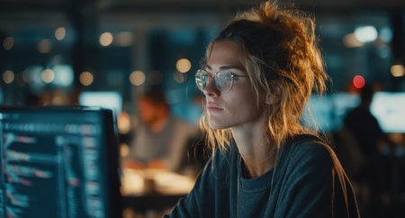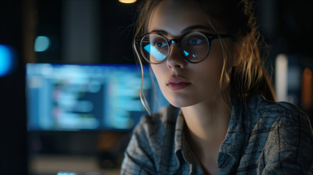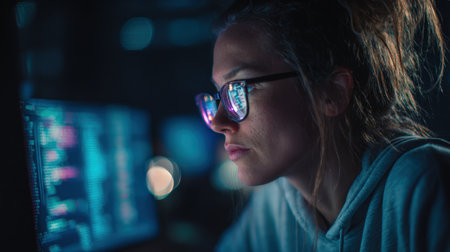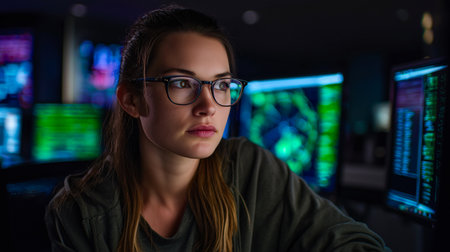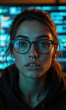 A young woman sits focused in a dimly lit workspace, wearing glasses and surrounded by multiple computer screens filled with colorful code.