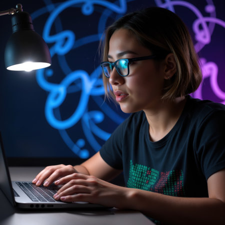 A young adult studying coding at night with neon ambient light, wearing glasses and focused on computer screens in dark room