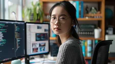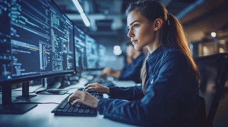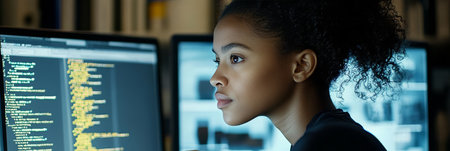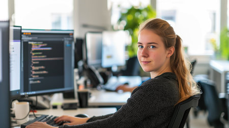 A young woman sits at a desk in an office. She focuses on her work in front of multiple computer screens. The screens show lines of code in a bright workspace, reflecting a tech environment.