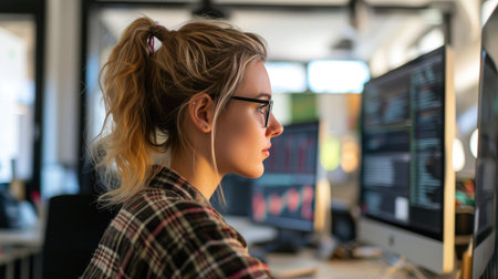 Young adult woman wearing glasses working on computer with code visible on monitor, side profile showing concentration and focus in modern office environment