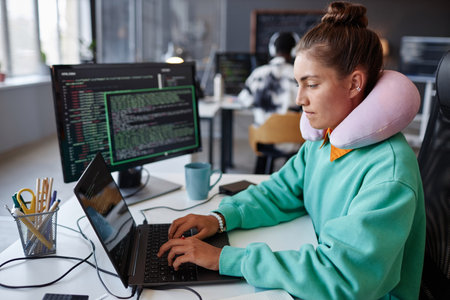 Tech-Savvy Woman Programmer Working Diligently in IT Office