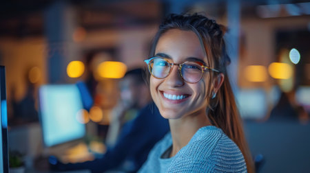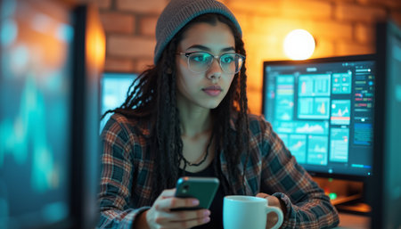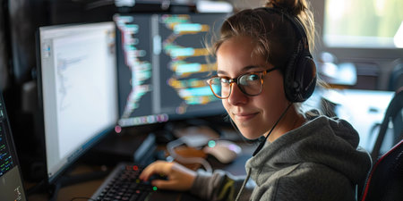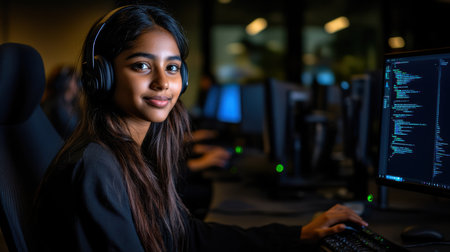 In a vibrant tech hub, a focused young woman with headphones smiles as she codes, illuminated by multiple screens filled with code. The atmosphere buzzes with creativity and innovation.