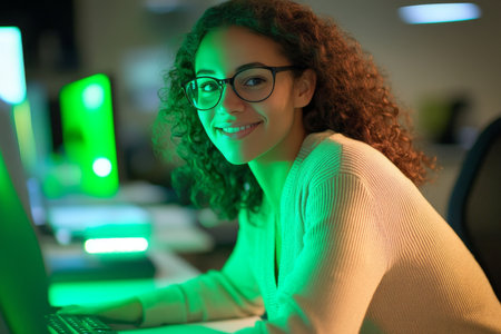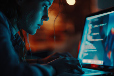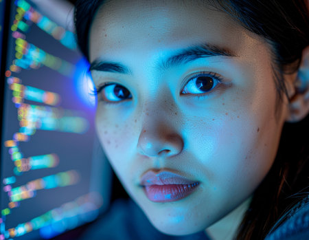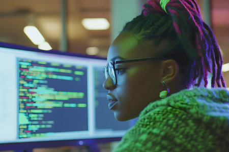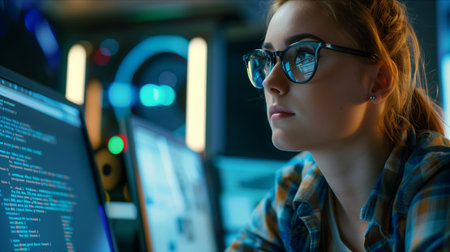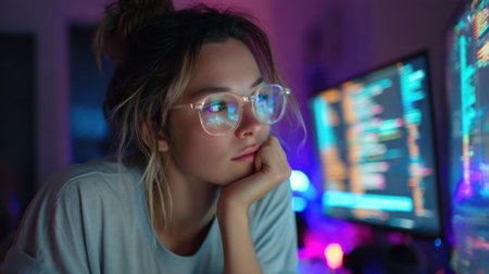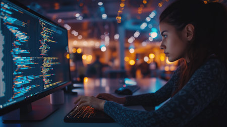 Young female programmer focused on code displayed on computer monitor, with colorful lights reflecting on her face, working in a modern tech environment at night.