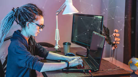 Modern young female programmer is writing program code on a laptop at home. Remote work in the IT profession. The concept of software development.