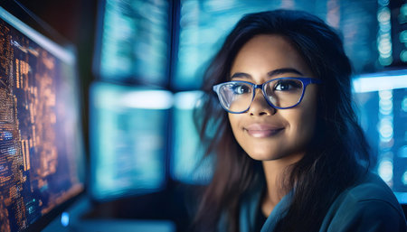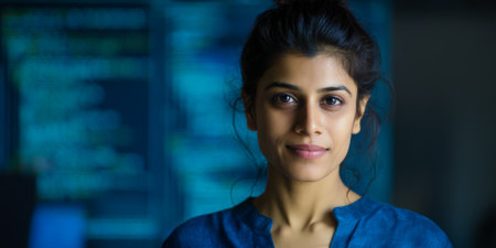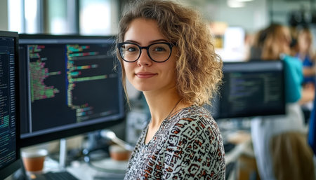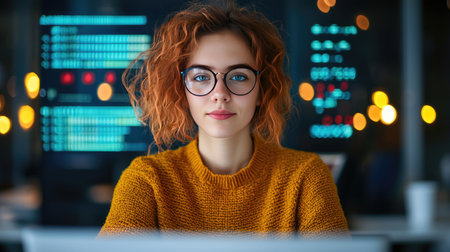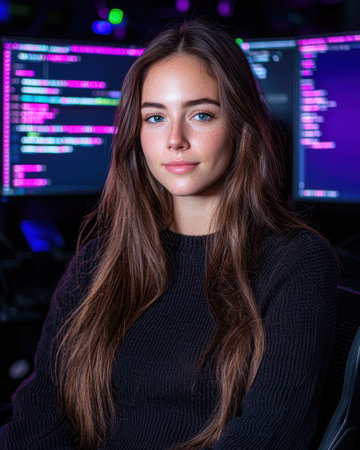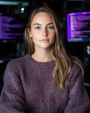 Portrait of a young woman programmer looking at the camera, with computer screens showing code in the background