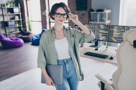 Portrait of charming confident lady hand touch spectacles hold wireless netbook loft room workstation