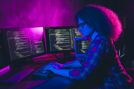 African American woman typing codes on computer while sitting at her workplace in dark IT office