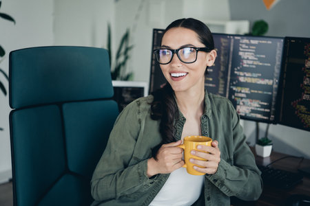 Young programmer or IT specialist satisfied with her work done..