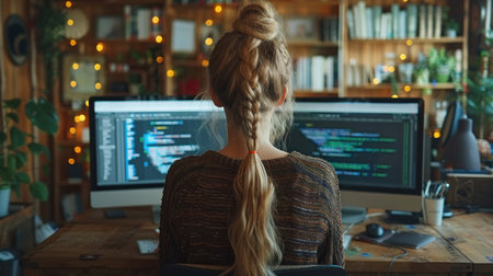 Young woman programmer in casual office setting working on coding tasks at a modern workspace with computer screens and decor