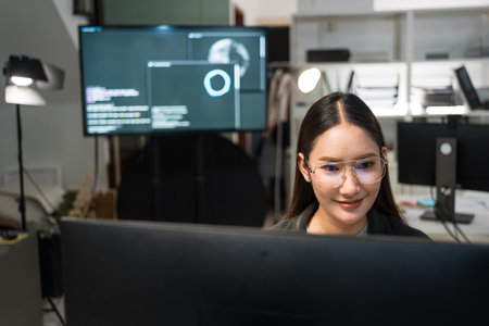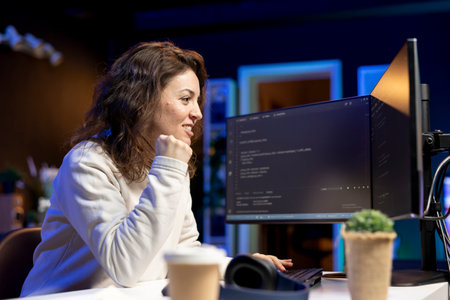 Dedicated Female Programmer Working Late in a Modern Office, Coding on Multiple Monitors with Focus