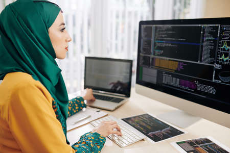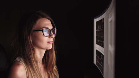 Side view of female programmer working with computer at modern office. Developing programming.