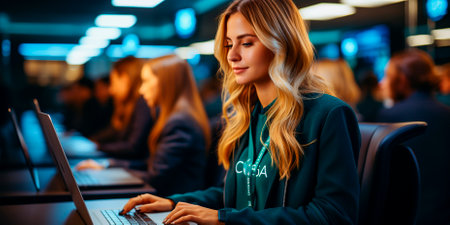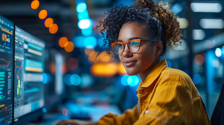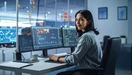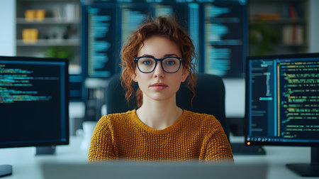 A young professional woman is working on her laptop in a modern office setting, exuding confidence and focus. She is surrounded by multiple computer screens displaying code and software, highlighting a tech-savvy environment.