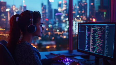 A focused woman programs at her desk in a high-rise office overlooking a vibrant city skyline at night, illuminated by colorful lights
