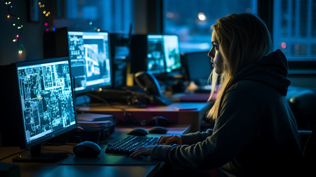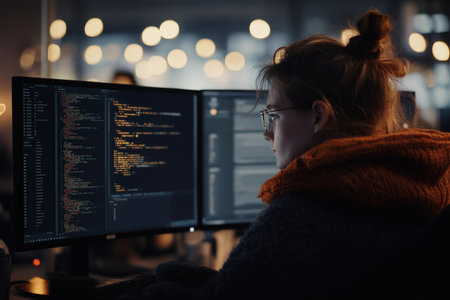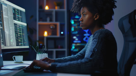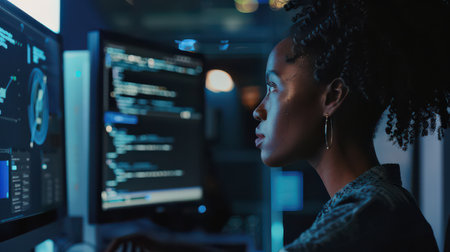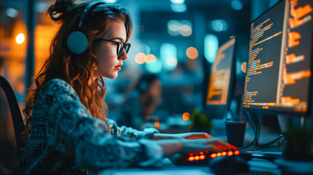 A young woman sits focused at a desk surrounded by multiple computer monitors displaying lines of code. Warm lighting creates a cozy atmosphere as she works diligently late into the night, immersed in her programming tasks and problem-solving.