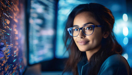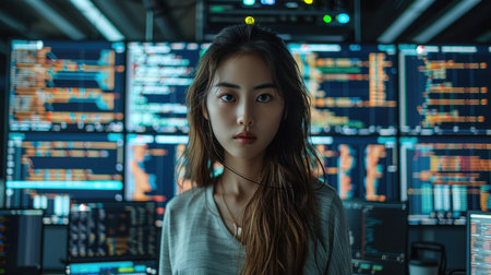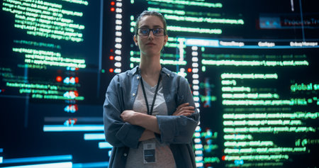 A woman looks directly at the camera while standing in a workspace. Computer screens show lines of code and data. The setting appears tech-oriented and modern.