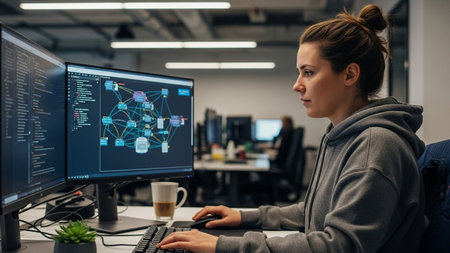 Confident Female Programmer Focused on Software Development Task, Reviewing Code on Dual Monitors