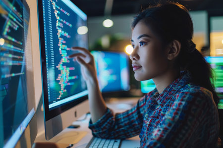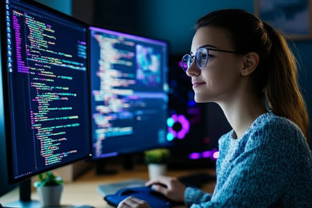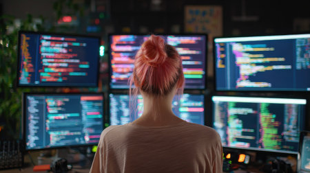 A female programmer engages with vibrant code on multiple screens within a modern tech workspace, showcasing the dynamic nature of software development.