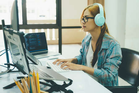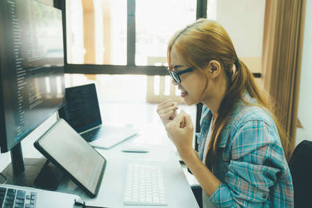 Female programmer working on coding, software development and web design.Concept technology development.