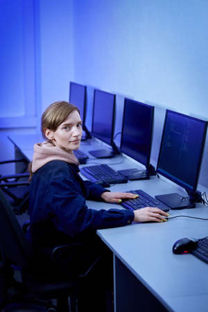 A young woman works in the evening in a computer class. He looks at the camera. Personal computers with a blank black monitor.