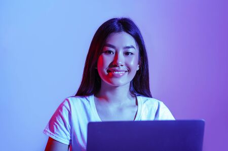 Young woman with a laptop. A woman is using a laptop. Blue and red light falls on a woman on a black background.