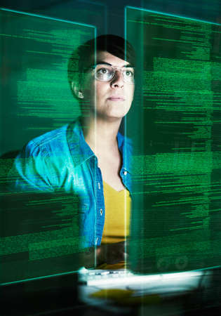 Young female programmer working on code late at night in tech workspace. Software management, inspection or IT programmer with overlay for problem solving, data or troubleshooting at night