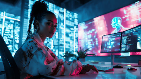 Amidst glowing screens and vibrant hues, a focused coder works diligently in a high-tech environment. The room pulses with data visualization, creating a cutting-edge atmosphere.