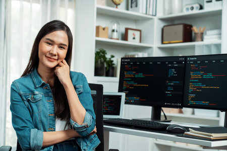 Young Asian IT developer looking at camera to present with online information on pc with coding program data application, wearing jeans. Surrounded by two screens.