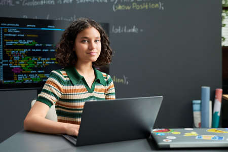 Portrait of teenage girl sitting at desk using laptop, looking into camera with confident expression, computer code displayed on monitor in background, technology education concept
