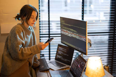 Young woman using phone while sitting at workplace with laptop and desktop computers at cozy home office interior. Concept of freelance and remote work at home. Woman wearing domestic clothes