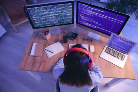 Woman writing programming code on laptops and desktop computer at cozy home workplace. Concept of remote programmer work at home