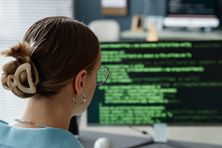 A focused woman coding at a computer, showcasing technology and programming in a modern workspace environment.