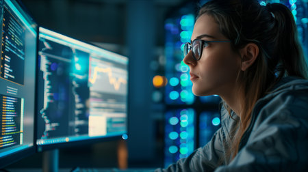 Dedicated Female Programmer Focused on Code on Multiple Monitors in a Dark Server Room