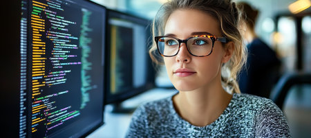 A young woman sits at a desk in front of computer screens displaying programming code. She looks focused and is wearing glasses, in a bright office space.