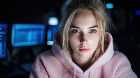 A woman looks directly at the camera with a serious expression. The room is dark with blue light from computer screens. She appears to be engaged in her work or study at night.