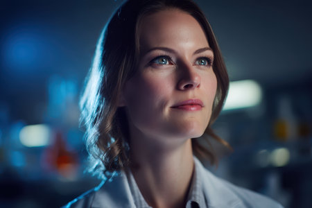 Young woman with shoulder-length hair wearing a white coat looks thoughtfully into the distance, surrounded by indistinct laboratory equipment, evoking a sense of curiosity and professionalism