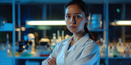 Focused Female Scientist Conducting Research in Modern Laboratory.