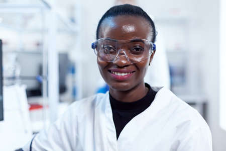 African health chemist in biochemistry laboratory looking at camera wearing protective glasses. Multiethnic team of researchers working in microbiology lab testing solution for medical purpose.
