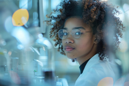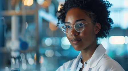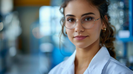 Close-up portrait of a young female scientist wearing glasses, showing a determined and confident gaze in a research environment.