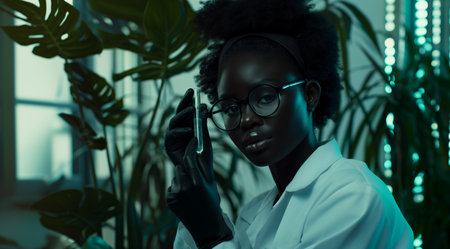 high-tech laboratory, photo of woman and modern scientific equipment, robotic manipulator or assistant helps female scientist, black girl doing research and looking at camera, AI generative image