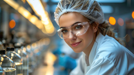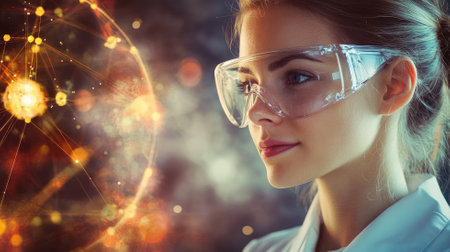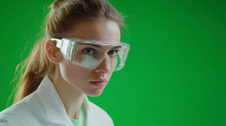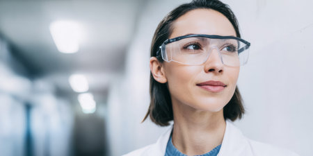 A focused young woman stands in a modern laboratory, wearing safety goggles and a white lab coat. The background features various scientific equipment, highlighting her dedication to research and safety in the lab environment