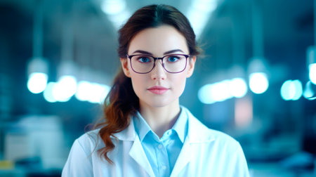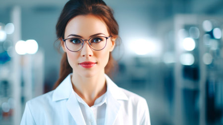 A woman in lab coat with glasses and a smile, AI